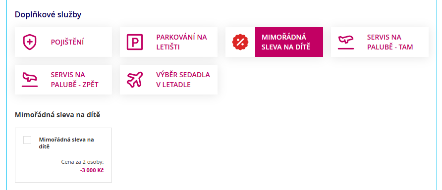 Získejte extra slevu až 2 000 Kč za každé dítě a vyrazte na letní rodinnou dovolenou za ještě výhodnější cenu! Slevu stačí během online objednávky zaškrtnout v sekci Doplňkové služby – žádný kód, žádné složitosti. Akce platí pouze do 31. ledna, tak neváhejte, zarezervujte si svůj vysněný hotel ještě dnes a ušetřete. Jak slevu získat?