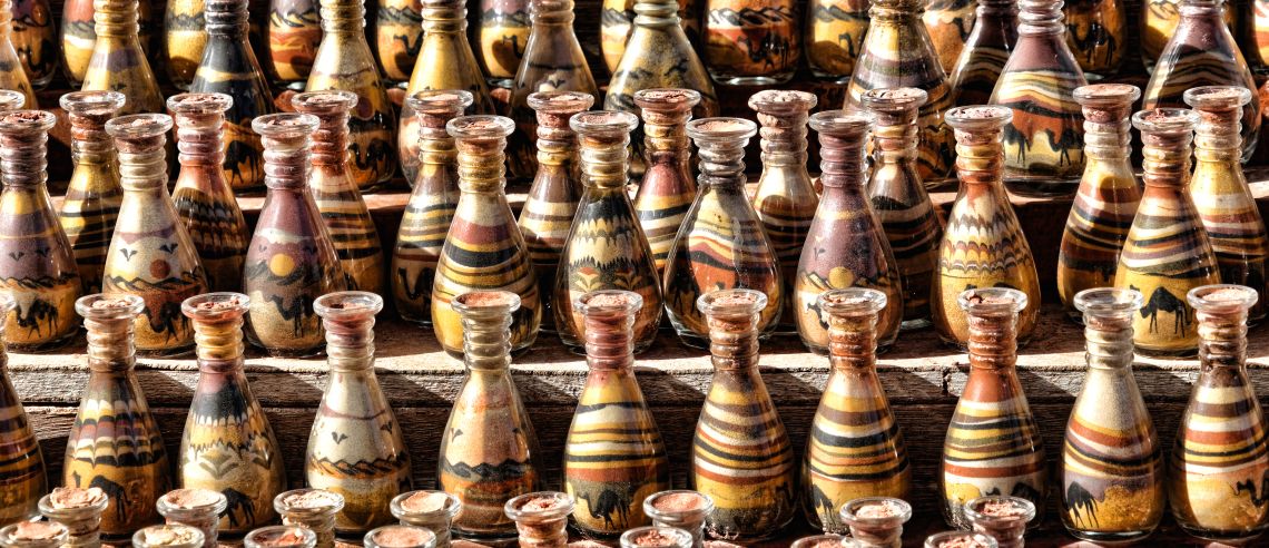 - místní specialita lahve s pískem (malé barevné lahvičky s exotickými motivy),