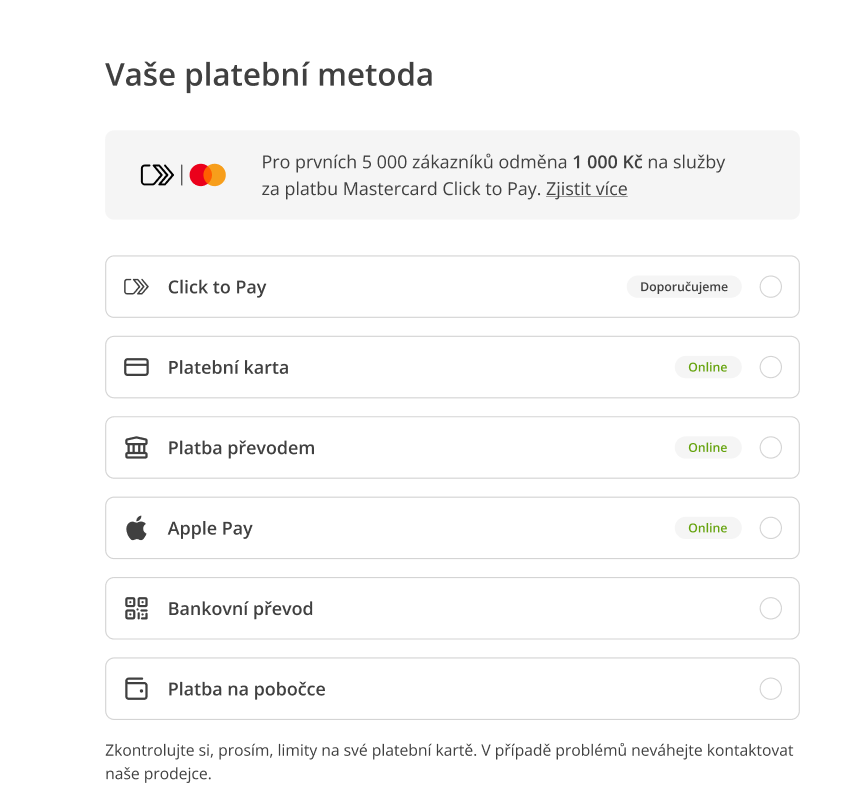 - Pro získání poukazu v hodnotě 1 000 Kč na doplňkové služby (dále jen poukaz) je nutné alespoň jednu platbu za zájezd na léto 2026 (celkovou cenu či minimální zálohu, v každém případě však v minimální výši 990 Kč) uhradit prostřednictvím platební metody Click to Pay s kartou Mastercard. Platební metodu Click to Pay je nutné zvolit i v rámci platební brány GoPay.