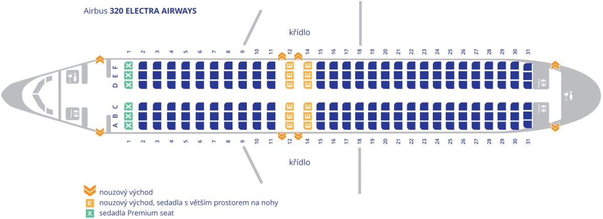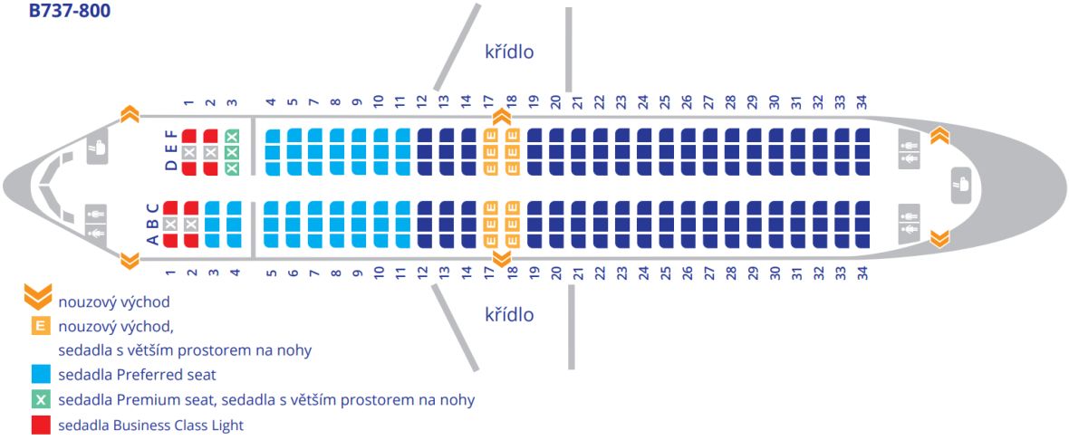 | Standardní sedadla v 2.polovině letadla od 12.řady včetně (nelze rezervovat na nouzovém východu) | Standardní sedadla v 1.polovině letadla do 11 řady včetně (nelze rezervovat u exitů a v předních řadách na premium místech) | Sedadla v přední části kabiny | Sedadla u nouzových východů mohou být obsazena pouze osobami přiměřeně zdatnými a silnými. Sedačky nesmí být obsazovány dětmi, osobami jakkoliv tělesně či mentálně postiženými, starými či fyzicky slabými či jinak nezpůsobilými Pokud cestující, kteří si zarezervují tyto sedačky, nebudou splňovat podmínky pro dopravu na místech u nouzových východů, mohou být posazeni na jiná místa a nebudou mít nárok na kompenzaci. Je zde zvětšený prostor na nohy (ideální pro vyšší osoby). | |